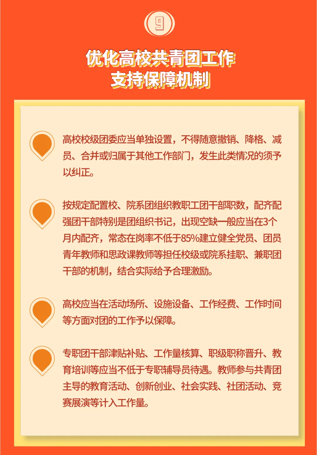 9. 优化高校共青团工作支持保障机制。高校校级团委应当单独设置,不得随意撤销、降格、减员、合并或归属于其他工作部门,发生此类情况的须予以纠正。按规定配置校、院系团组织教职工团干部职数,配齐配强团干部特别是团组织书记,出现空缺一般应当在3个月内配齐,常态在岗率不低于85%。建立健全党员、团员青年教师和思政课教师等担任校级或院系挂职、兼职团干部的机制,结合实际给予合理激励。高校应当在活动场所、设施设备、工作经费、工作时间等方面对团的工作予以保障。专职团干部津贴补贴、工作量核算、职级职称晋升、教育培训等应当不低于专职辅导员待遇。教师参与共青团主导的教育活动、创新创业、社会实践、社团活动、竞赛展演等计入工作量。