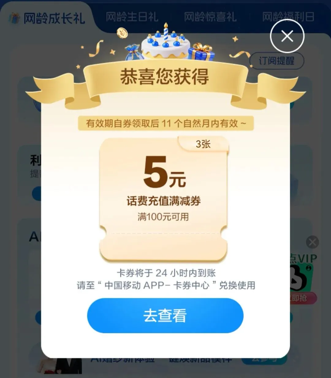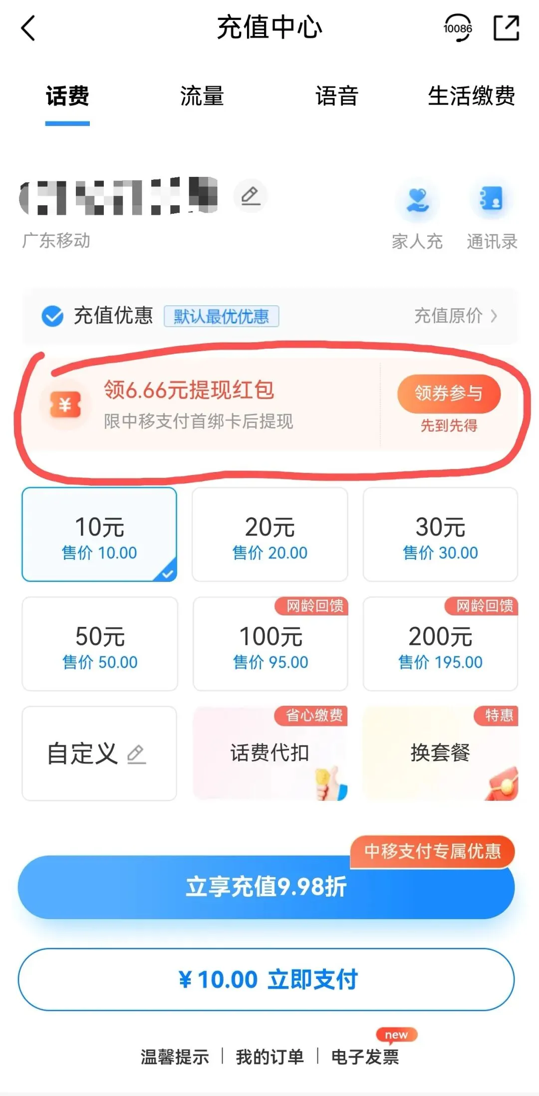 无意之中发现的提现红包,在中国移动App充话费白捡了6.66元,起因是这样的,网龄生日礼有送100-5的充值券,