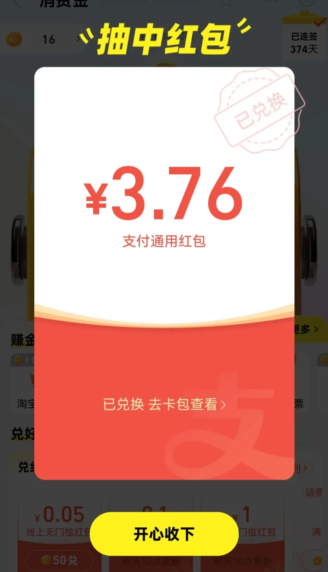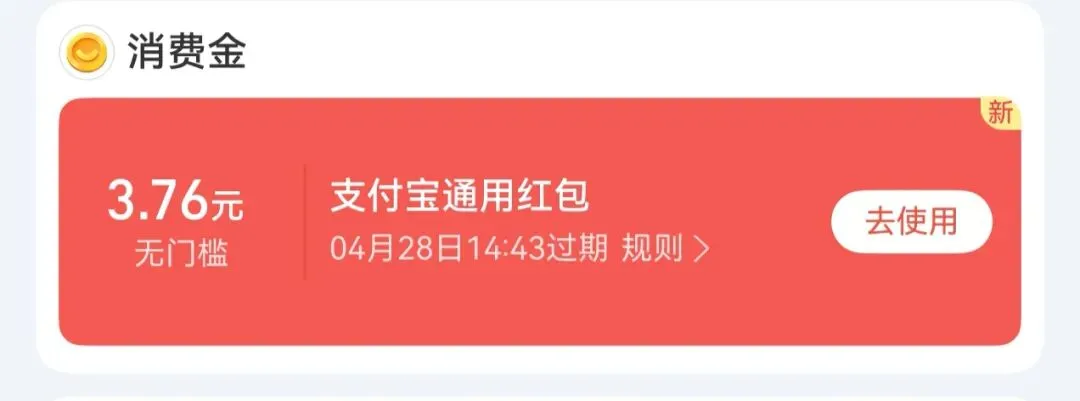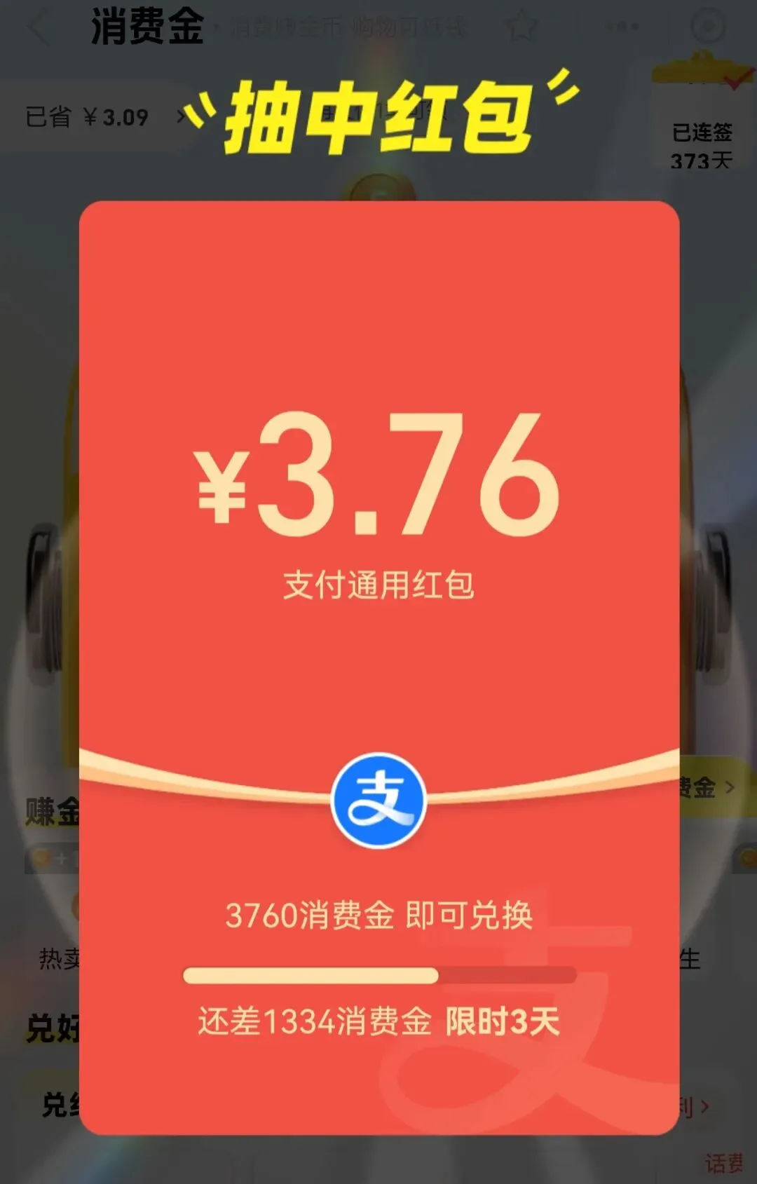 支付宝消费金又抽中了红包,手气不错!