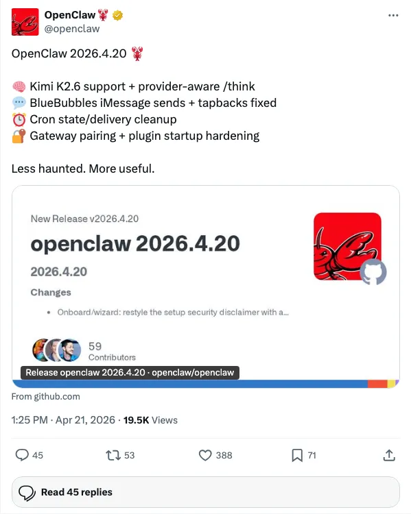 如果只用一句话收尾,这次 OpenClaw 更新真正推进的,是让新手更容易上手,让长期运行环境更不容易失控。从官方更新说明到 v2026.4.20 发布页,这条方向已经很清楚了。