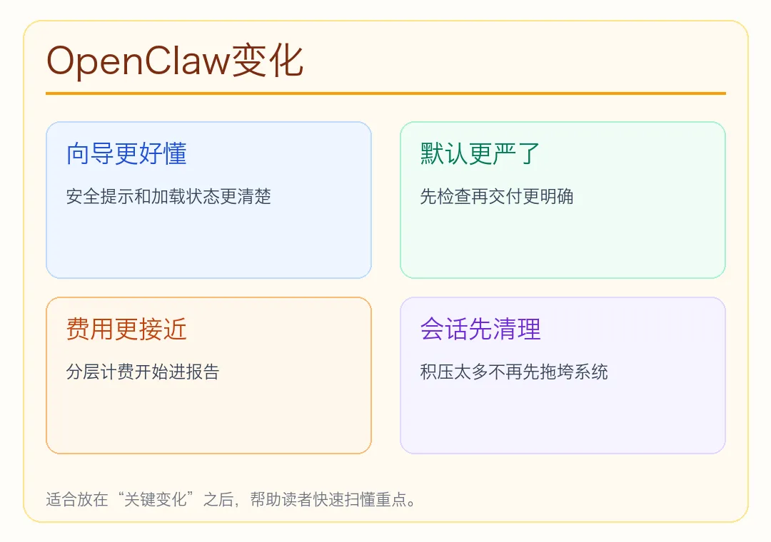 这次 OpenClaw 的更新,不像那种单点爆发的新功能,而是把安装引导、提示词策略、成本统计和会话维护一起收紧了一轮。