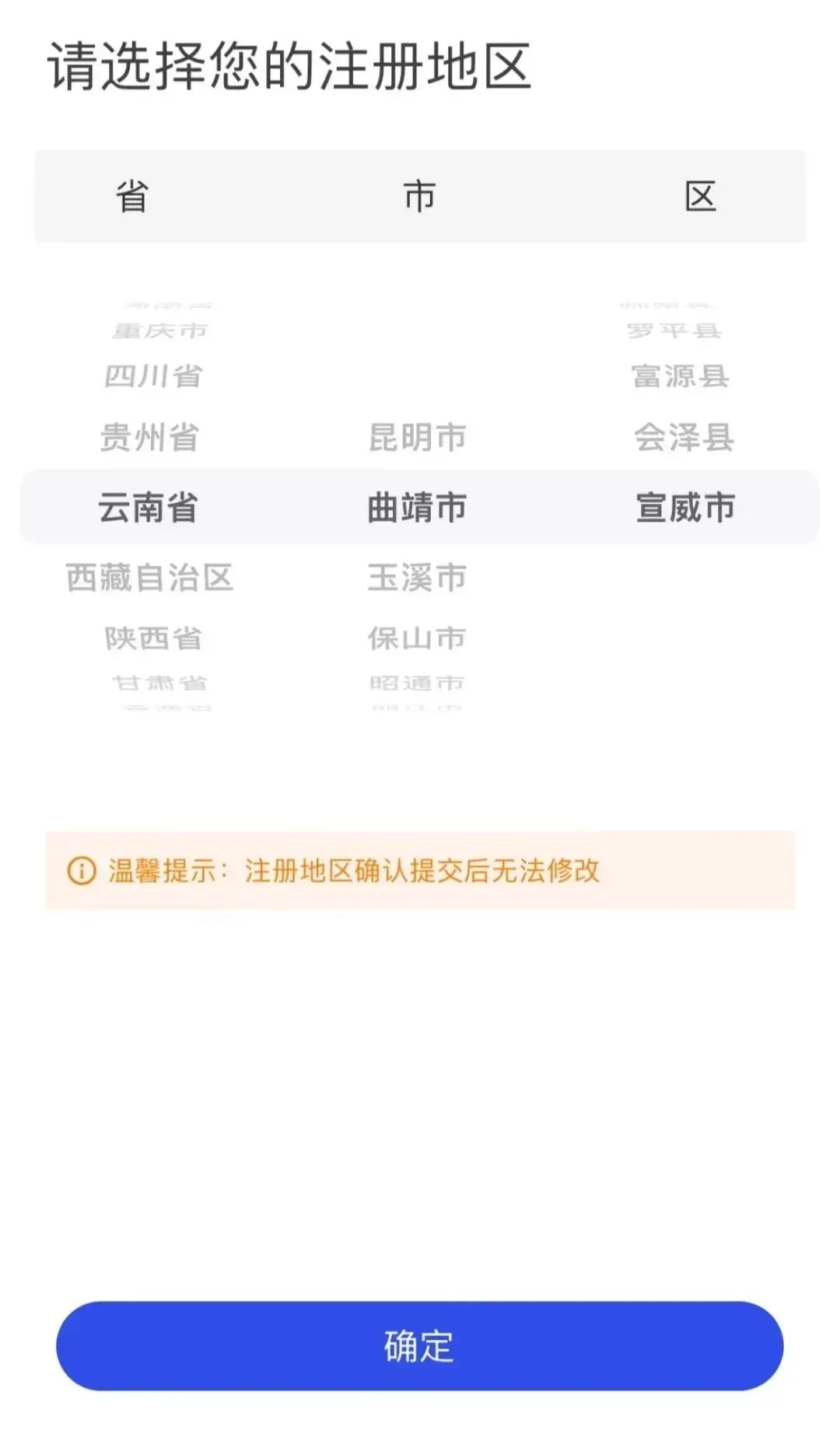 4. 必须填写所在地区为“云南省 曲靖市/ 区/县”,详细地址注明所在镇街,详细到门牌号;
