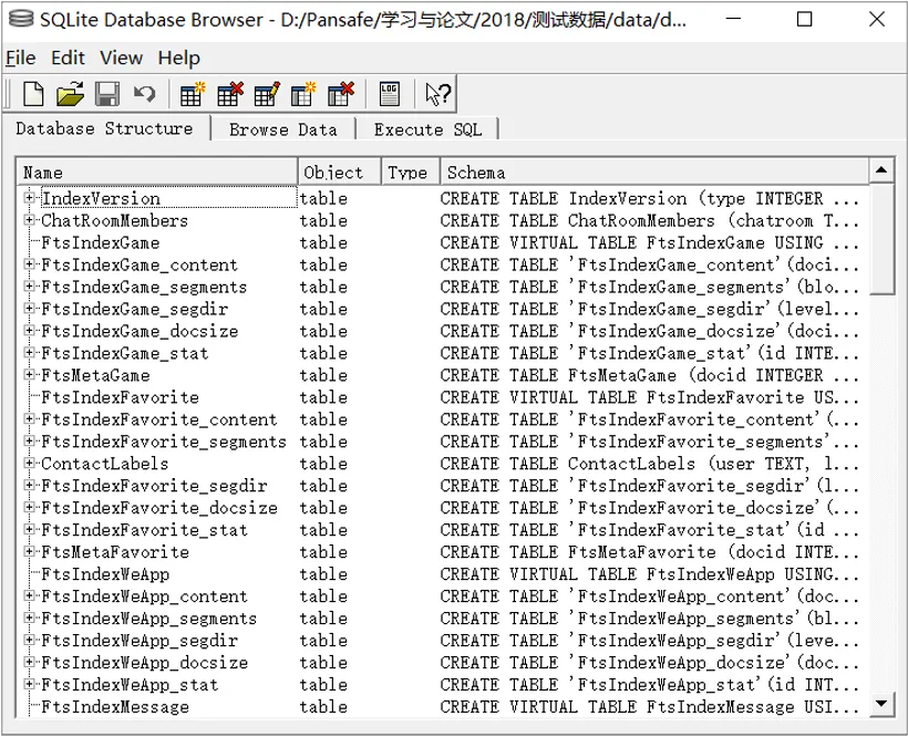 该bak文件经过压缩加密,加密方式未公开。我们通过研究获得了解密密钥(密钥组成暂不公布),并通过腾讯的开源工具成功解压,从而能够打开该bak文件,内部结构与EnMicroMsg完全相同。