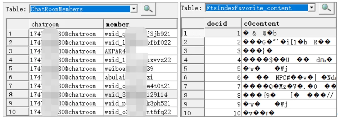 其中数据表包括了群组及成员、游戏、收藏、通讯录、好友标签、消息内容等。依次对重要数据进行分析,发现群组及成员对应ChatRoomMembers表内容为明文,如下图所示: