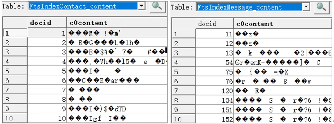 收藏内容(FtsIndexFavorite_content)、通讯录内容(FtsIndexContent_content)、消息的容(FtsIndexMessage_content)等表项中内容字段均为密文,如下图所示(乱码的即为密文):
