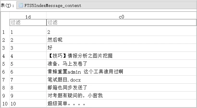 目前6.6以后版本的微信索引文件已更新为FTS5IndexMicroMsg.db,所有表名称变更为FTS5开头,内容字段均为明文,如下图所示为某微信索引的消息内容。