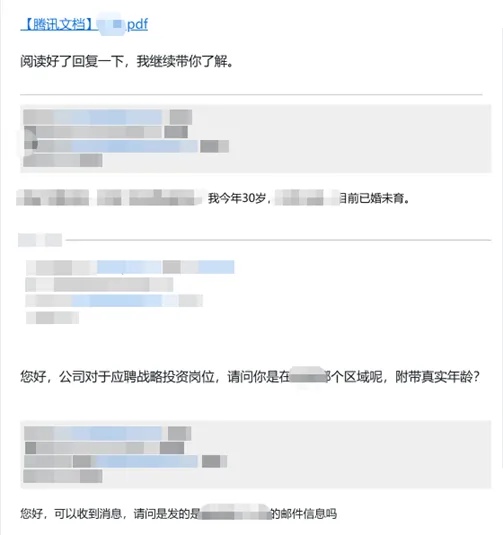 第一位诈骗犯是以个人名义联系我的,之前他先给我打了电话,声称是某XX公司的HR,询问我的邮箱地址,说要给我发送岗位相关资料。随后我就收到了一封来自个人邮箱的邮件,里面除了一些常规的求职询问,还附带了一份公司信息文件。