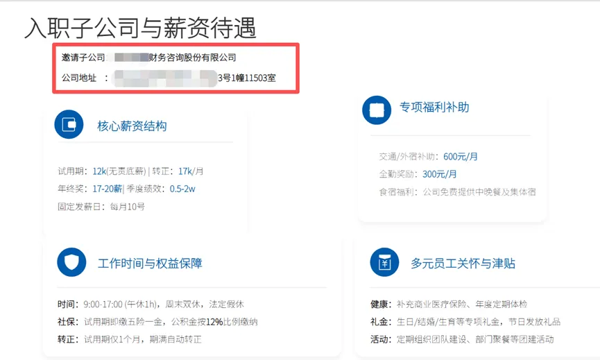 为了核实真实性,我在3个招聘平台上都检索了这个公司,发现目前确实是在招人。随即我打开了这个pdf文件。有意思的来了,整个文件看似是某家大型公司的资料,但标注的入职公司又显示了另一家财务公司,声称是子公司。