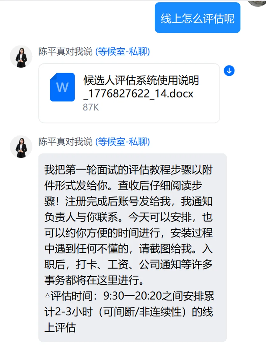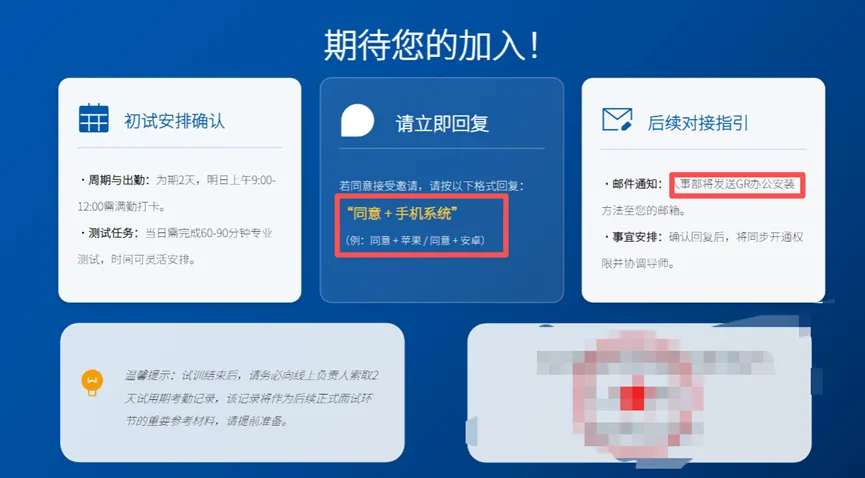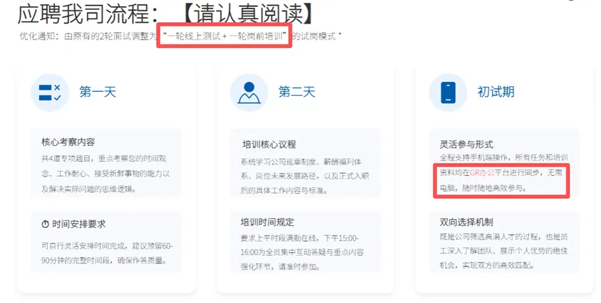 文件提到:在面试流程中,要求下载“GR办公平台”。还特意强调:“全程支持手机操作,无需电脑”。引导求职者回复“同意+手机系统”,强化“用手机参加”的意识。在后续对接指引上,还提前“打预防针”:“人事会发送GR办公平台的安装方法给你,你按着提示操作即可。