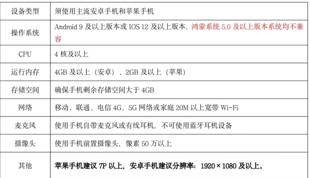 手机配置要求:
