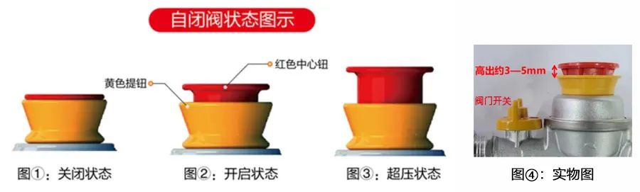 燃气自闭阀的用法:打开阀门开关(手柄旋转至与管道方向平行)轻轻拉起提扭至第一档开关(图②),可正常用气。如用力过大则会拉至第二档形成超压关闭(图③);开阀后阀门处于自动检测状态,燃气使用完毕后不必将提钮复位,只需要关闭阀门开关(图④)。