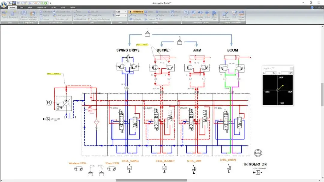 Automation Studio 面向液压、气动、电气及自动化系统的设计与仿真,提供以原理图为核心的建模方式。用户可在同一环境中完成系统设计、元件选型及仿真验证,并生成相关技术文档。