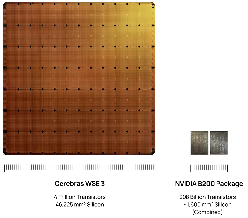 与包含两颗独立芯片的英伟达B200封装相比,WSE-3拥有19倍的晶体管、250倍的片上内存容量和2625倍的内存带宽。