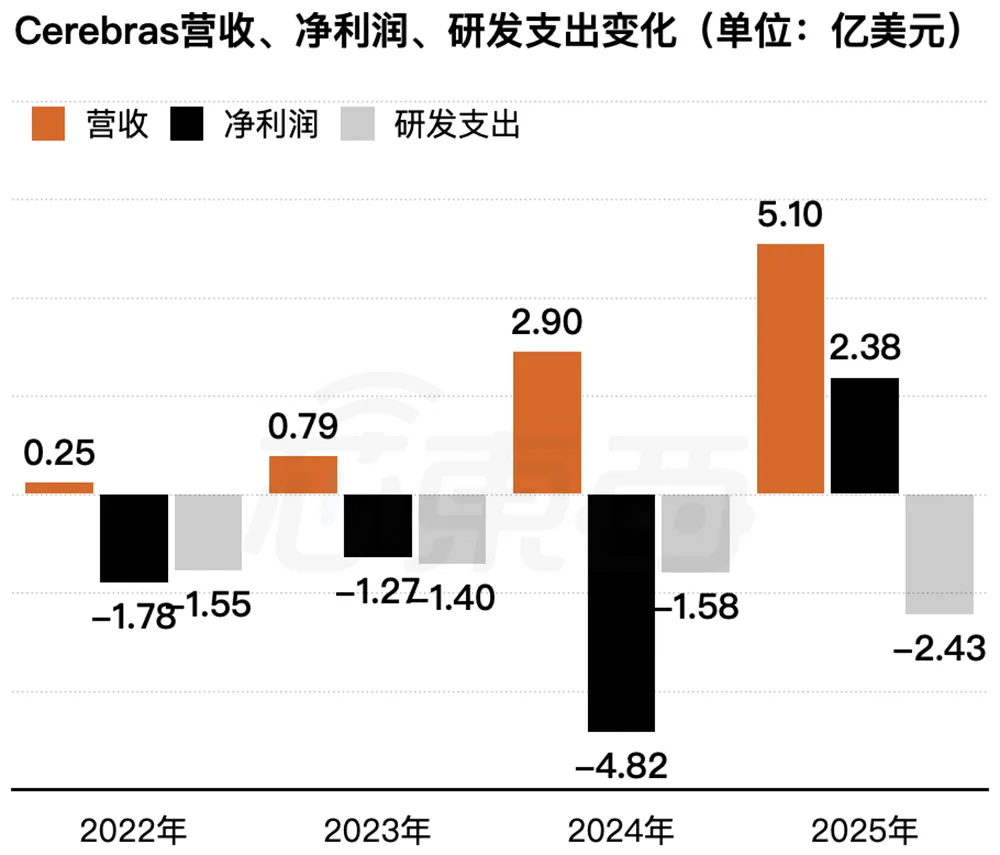 2022年、2023年、2024年、2025年,Cerebras全年营收分别为2460万美元、7870万美元、2.90亿美元、5.10亿美元;净利润分别为-1.78亿美元、-1.27亿美元、-4.82亿美元、2.38亿美元,研发费用分别为1.55亿美元、1.40亿美元、1.58亿美元、2.43亿美元。