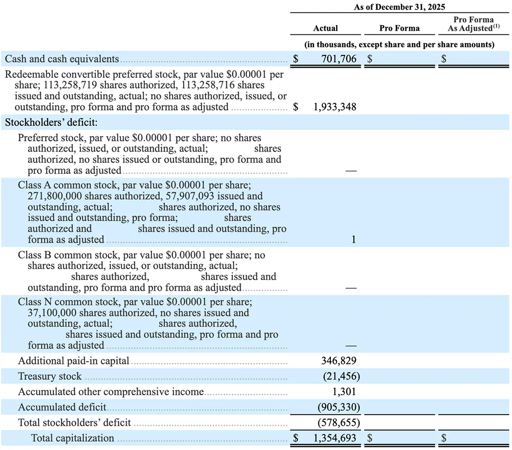 截至2025年12月31日,该公司累计亏损为9.05亿美元。下表是截至2025年底的现金及现金等价物和总资本: