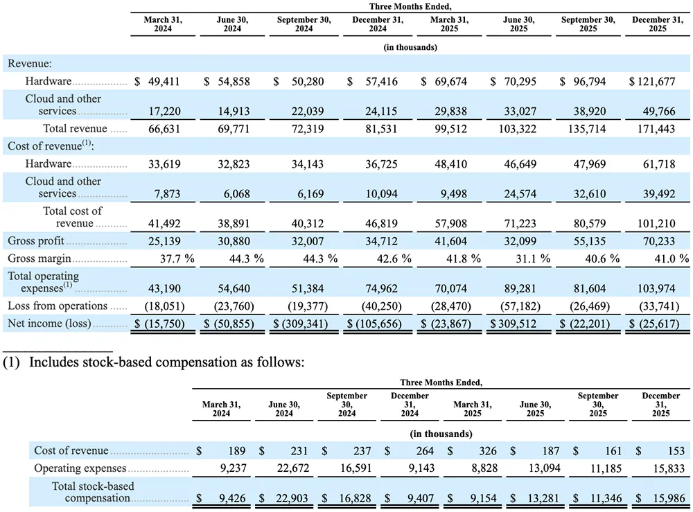 下表是Cerebras从2024年Q1到2025年Q4每个季度的财务数据,可以看到2025年扭亏为盈主要是靠在2025年Q2实现约3.10亿美元的净利润。