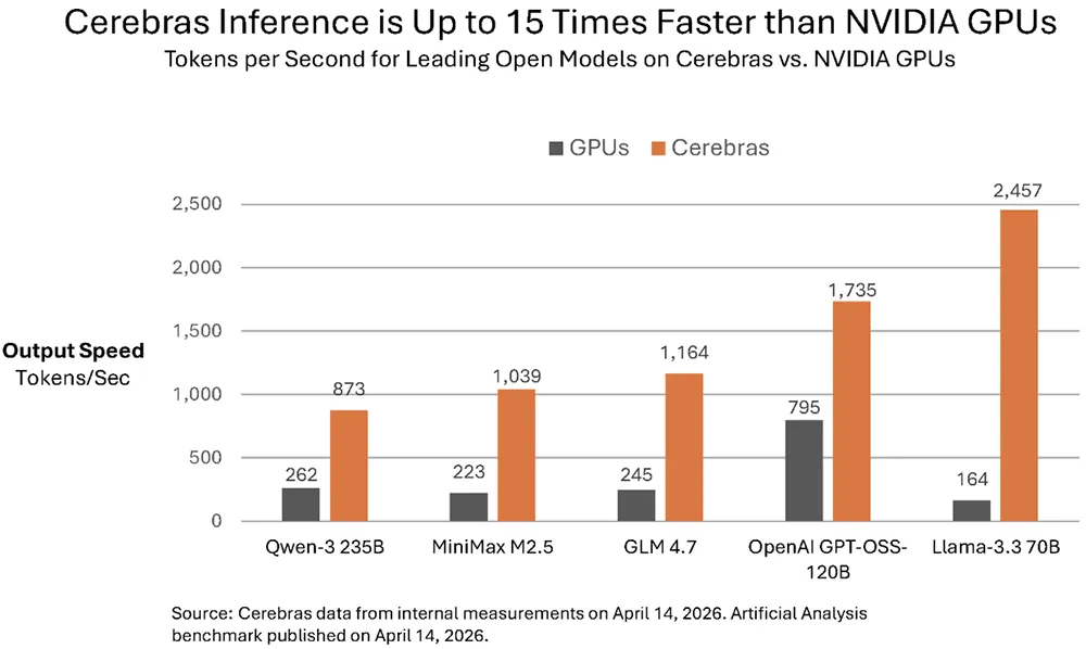 IPO文件显示,根据基准测试,对于许多工作负载,Cerebras运行Llama、GPT-OSS、GLM、MiniMax、Qwen等开源模型的速度比基于GPU的领先解决方案快15倍;在一些更特殊的工作负载中,Cerebras的速度快1000多倍。