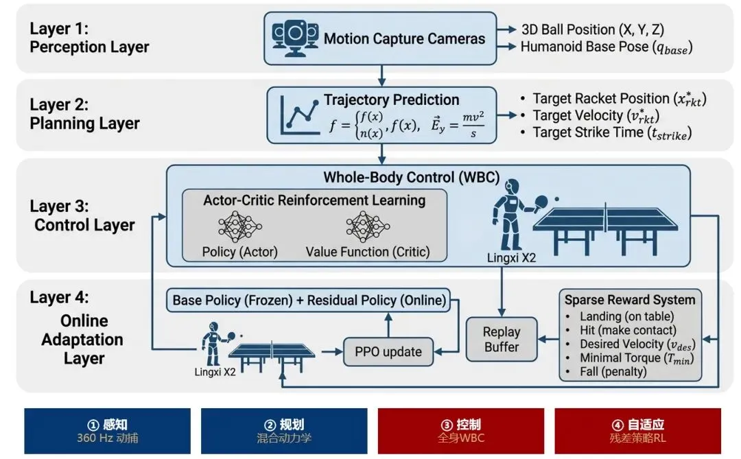 这套系统之所以关键,不在于“机器人会打球”这一结果本身,而在于它针对人形机器人乒乓任务最难的几个技术瓶颈,给出了系统性的解决方案。