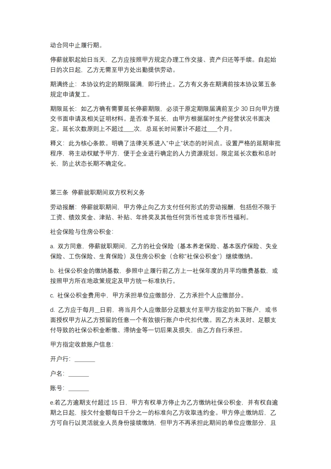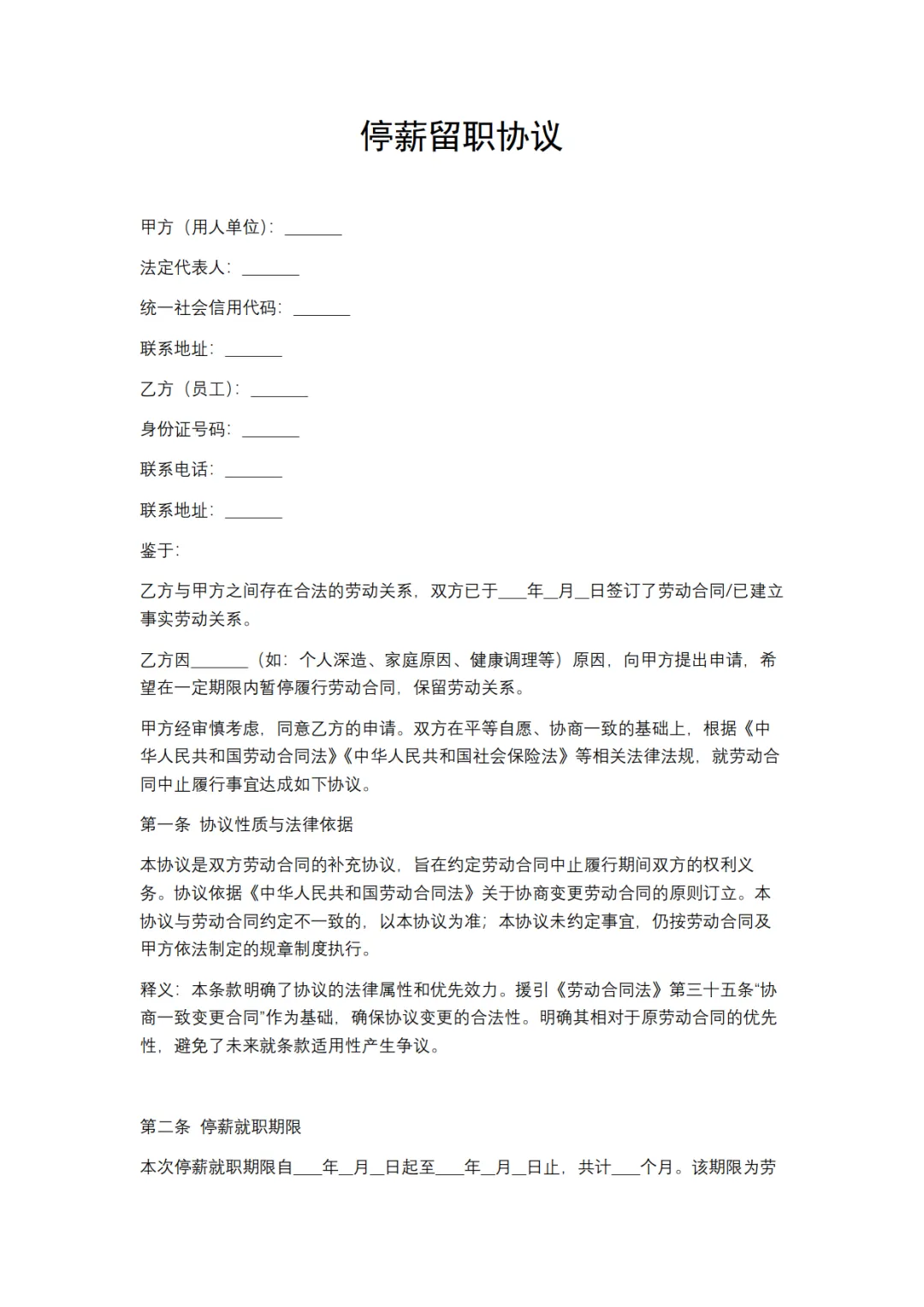 停薪留职协议模板,WORD文档电子版,可免费下载打印