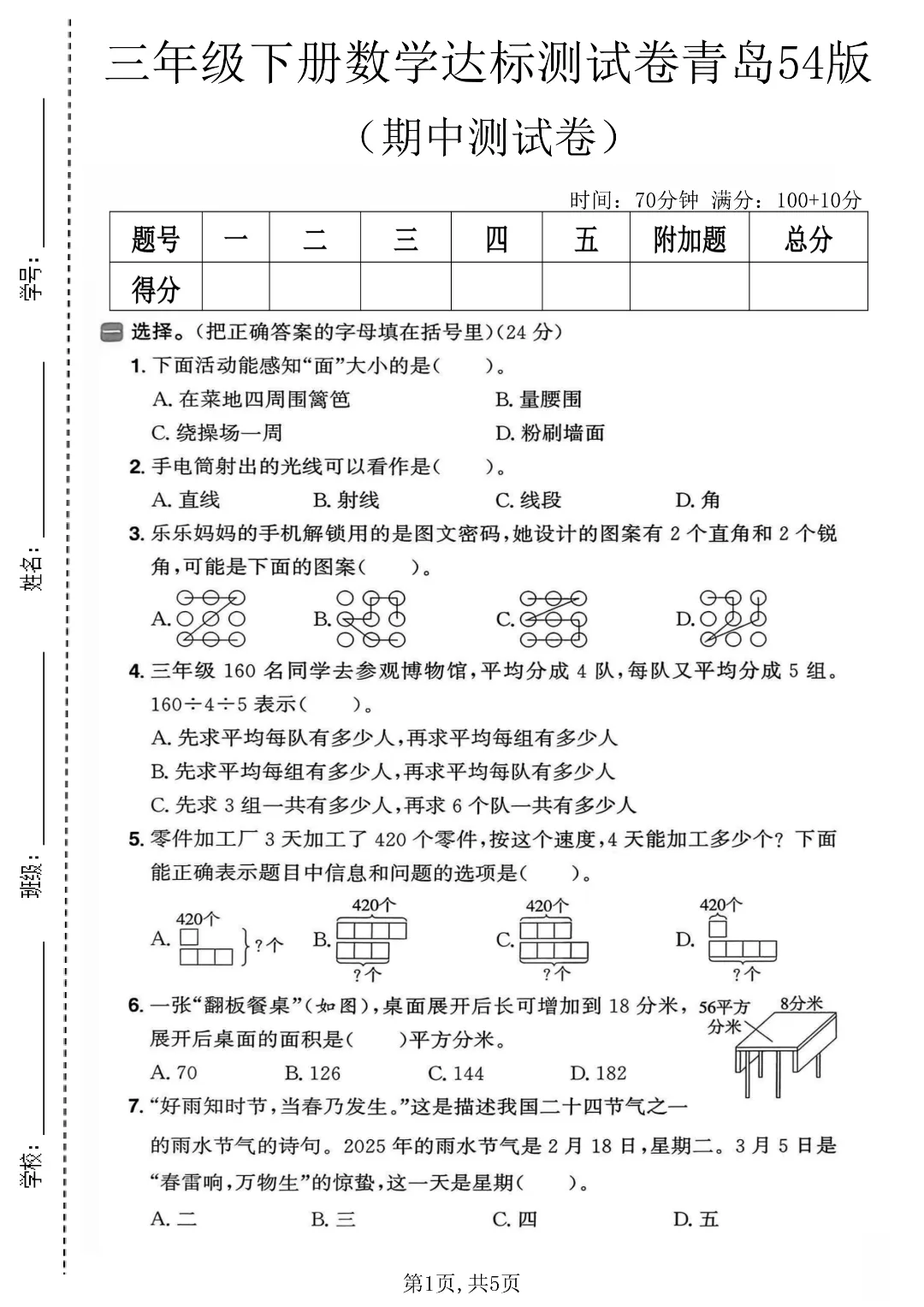 26年春新三年级下册青岛54版数学《期中考试质量检测卷4套》附答案解析 可打印