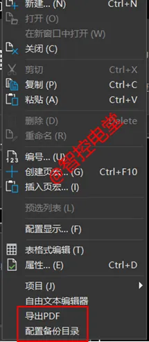 使用此插件同样的也是需要对插件进行加载才行,可以翻阅前期的分享查看加载方法;加载完成后在页导航器的在项目树右击会多出两个上下文菜单栏分别是配置备份目录和导出PDF,如下图所示。