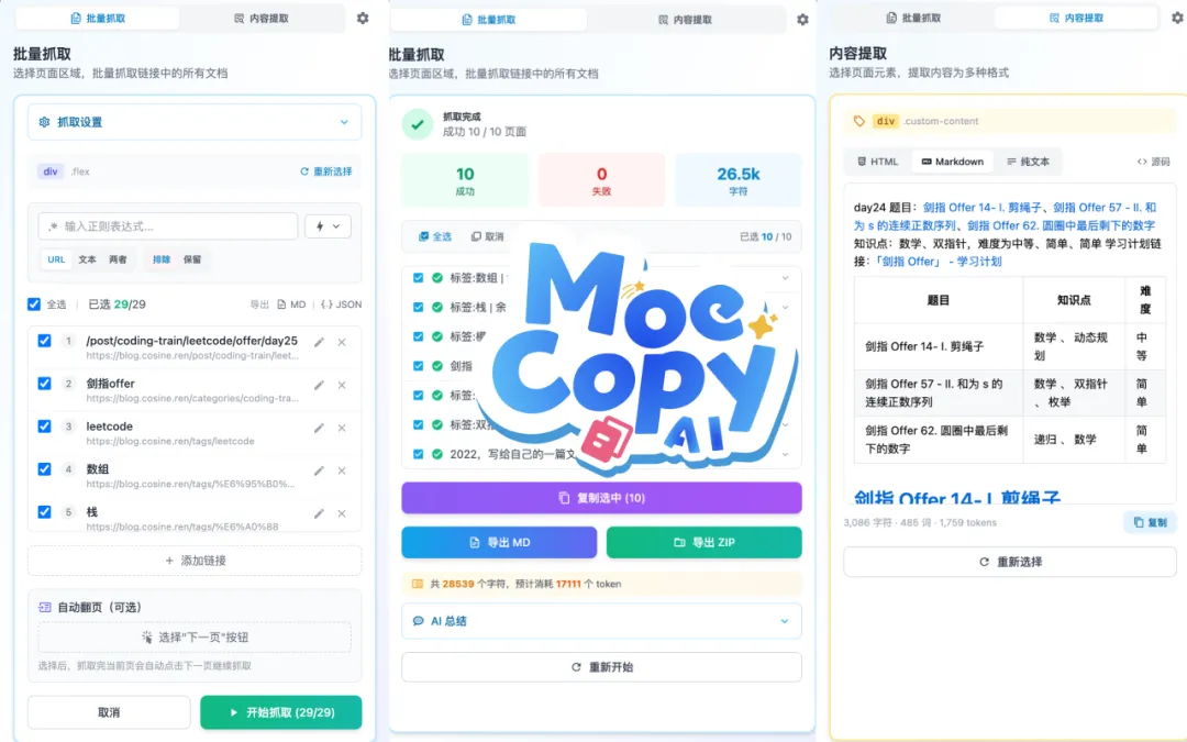 基于 Plasmo 框架开发的浏览器扩展「Moe Copy AI」支持智能识别网页结构化数据、批量抓取、AI 内容摘要,为 AI 模型提供高质量输入。据作者介绍:需求很简单,是我想在手机端 kiwi 浏览器访问的时候能够直接复制全文、标题、作者和网页元信息等,排除干扰,然后进行摘要,就类似 llms.txt 那样。