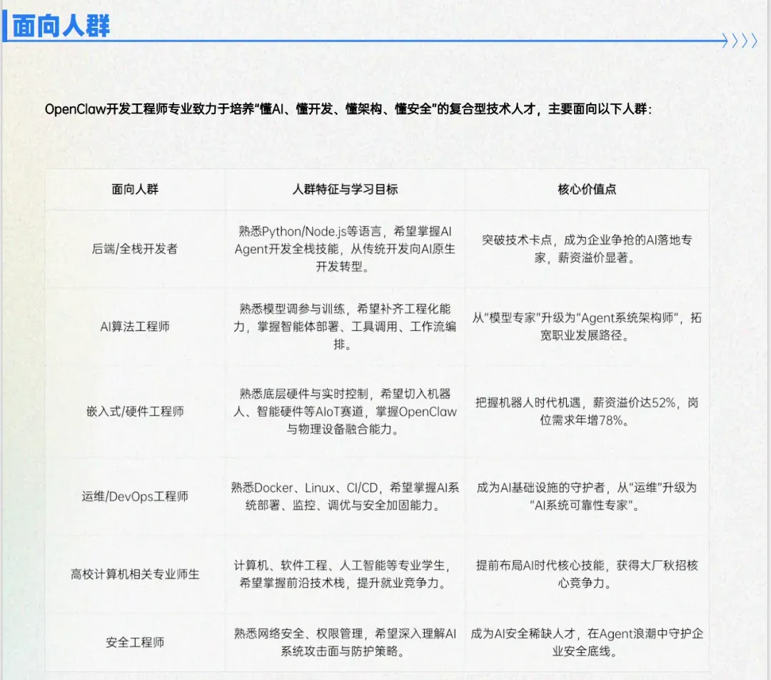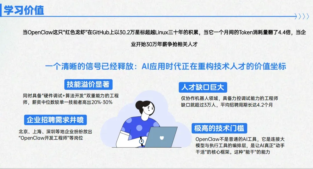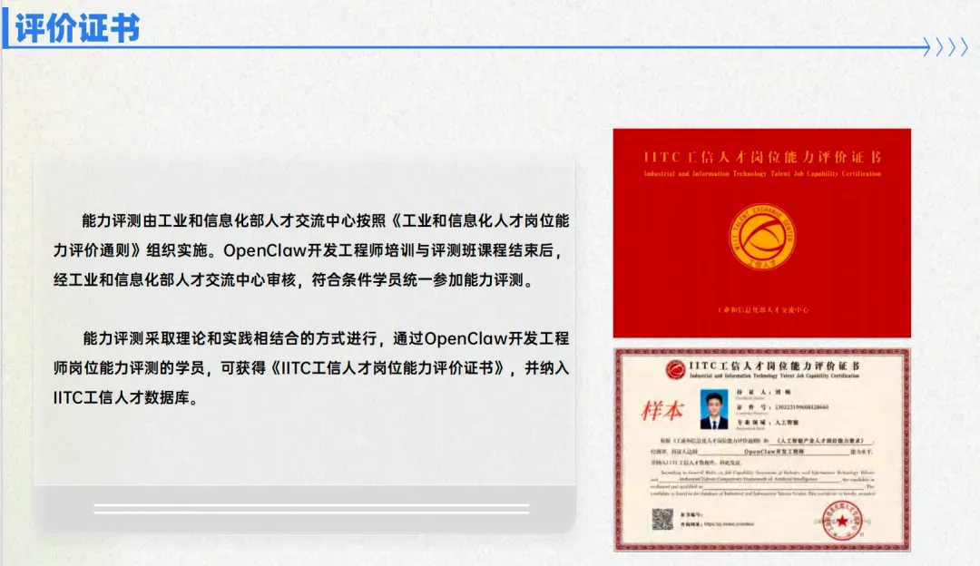 获得《OpenClaw开发工程师》评价证书的学员纳入工业和信息化部人才交流中心人才数据库,评价结果可作为企事业单位招聘就业、岗位晋升、薪酬提升等方面的参考。