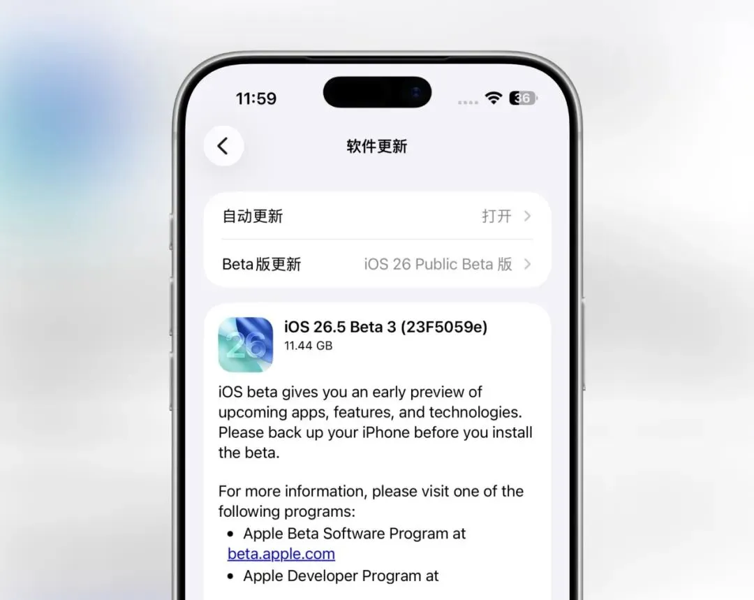 在 iOS 26.5 Beta 3 发布后一天,苹果又为参与了公测计划的用户推送了: