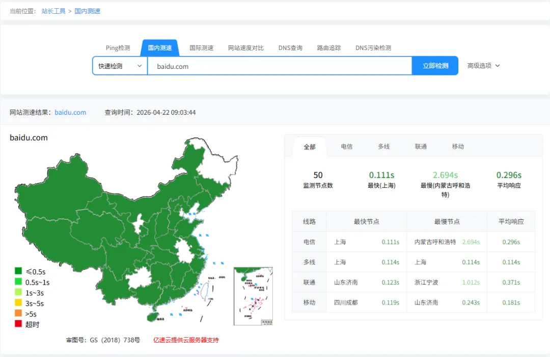 直观展示全国响应延迟热力图、最快 / 最慢节点、全网平均访问耗时,帮站长评估网站全国访问质量