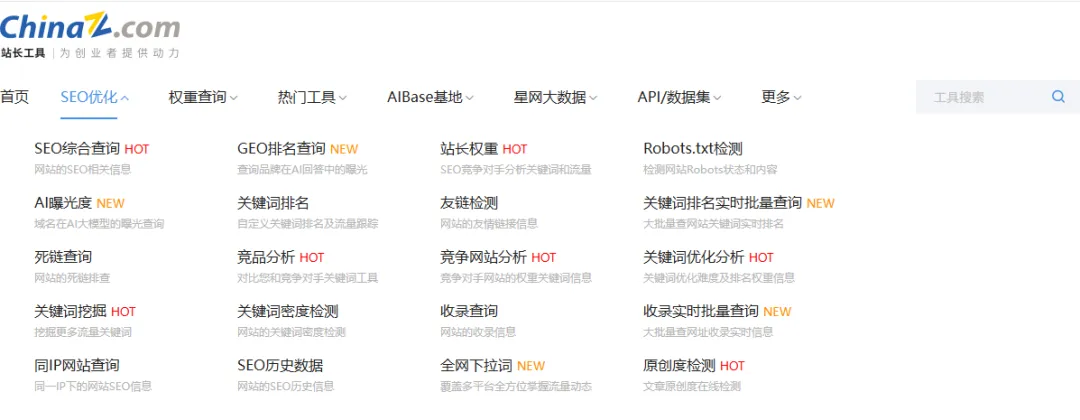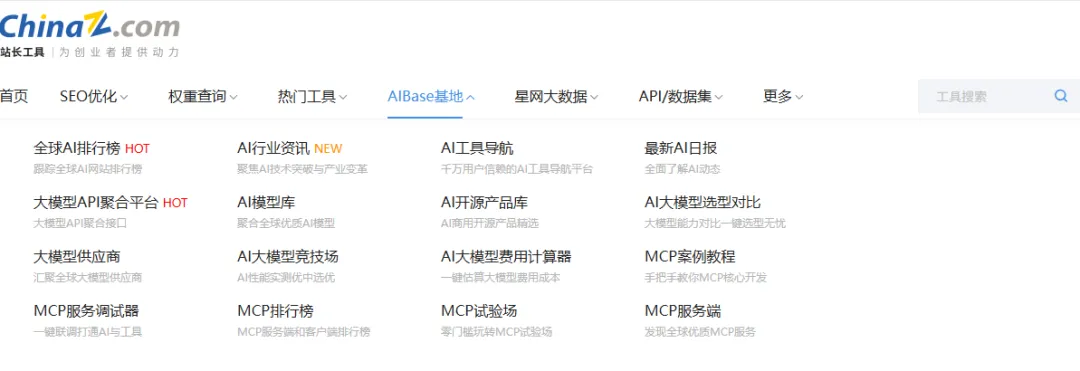 从最基础的网络测速、域名备案,到专业 SEO 排名,再到当下热门的 AI 大模型生态工具,全站工具高度集成,不用分散找多个平台