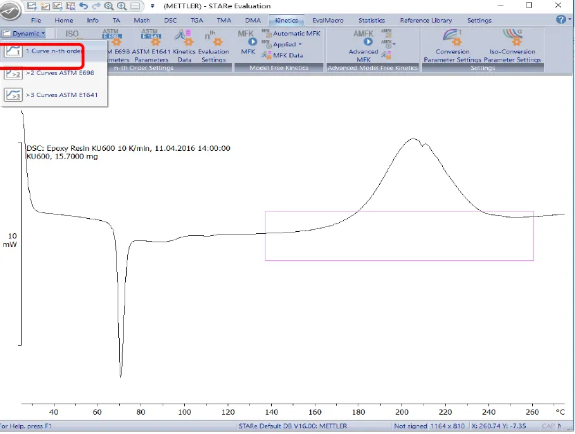 3、选中需要进行分析的放热峰,若只有一条曲线,则点击“Kinetic>1curve n-thorder”(若有三条曲线,可选择“>2 curves n-th order”),即可得到指前因子k,活化能Ea和反应级数n。