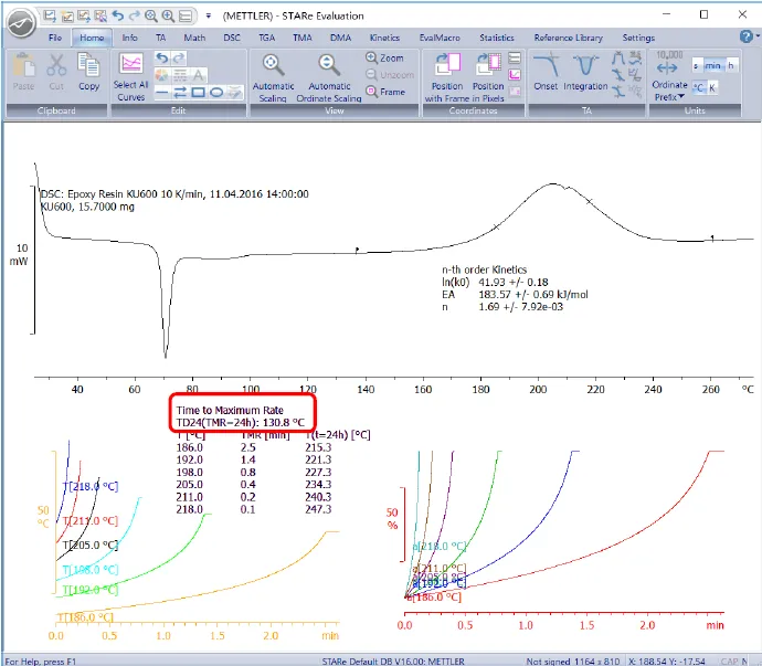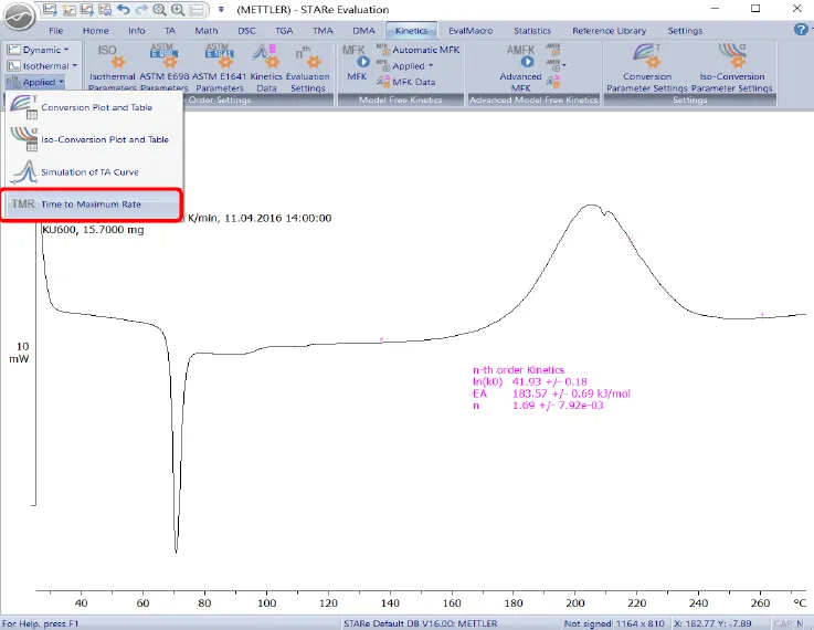 4、选中计算得到的指前因子k,活化能 Ea和反应级数n,点击“Kinetic >Applied>TMR”,在弹出的对话框中,可以在 Temperature 中输入所关心的温度点,也可以直接使用默认参数,然后点击OK,即可得到所关心温度的TMR及放热反应的TD24。