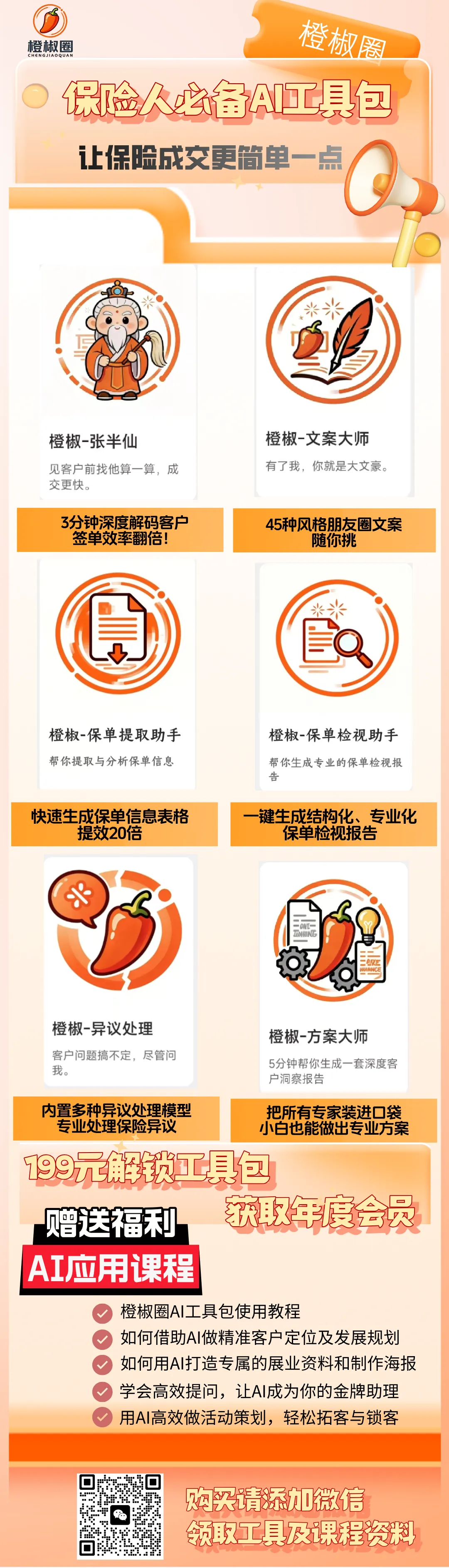 解决保险业务员找客户“瞎忙”的问题,不用再散弹枪式见人就问,用AI帮你分析自己的优势、圈层和沟通风格,找到最适合自己的精准客户群体,还能制定明确收入目标的短期+长期展业规划,让展业有方向、不迷茫。