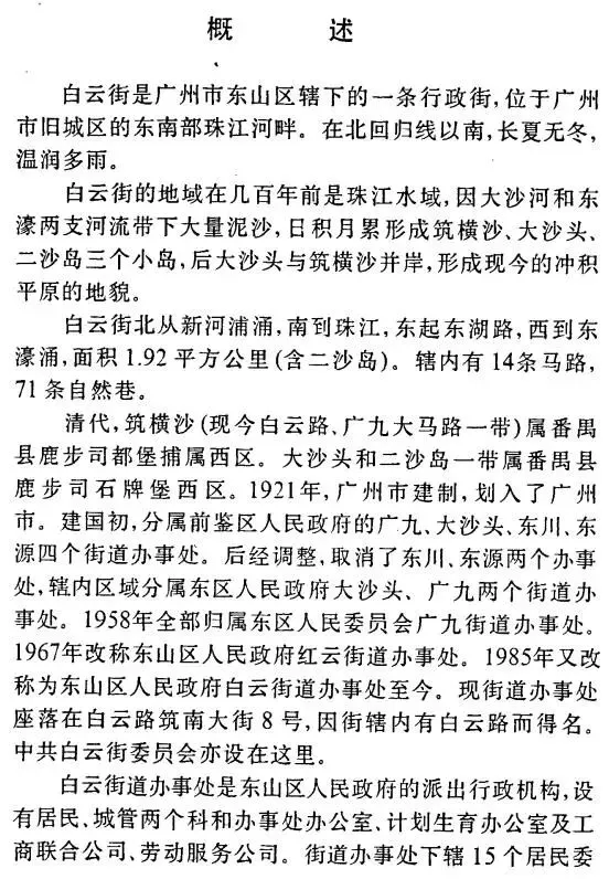 内容简介:本志记述了白云街的自然、政治、经济、文化等各方面发展的历史与现状。白云街是广州市东山区辖下的一条行政街,位于广州市旧城区的东南部珠江河畔。在北回归线以南,长夏无冬,温润多雨。白云街的地域在几百年前是珠江水域,因大沙河和东濠两支河流带下大量泥沙,日积月累形成筑横沙、大沙头、二沙岛三个小岛,后大沙头与筑横沙并岸,形成现今的冲积平原的地貌。