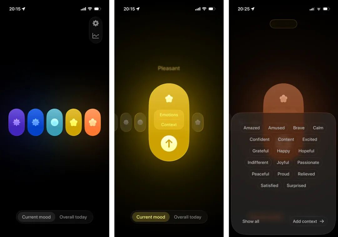应用采用黑色风格设计,在 iPhone 17 Pro 屏幕上应用底色与机身浑然一体。主页高亮五枚椭圆形胶囊,分别代表五种情绪,默认排序下从左到右依次为非常不愉快、不愉快、不悲不喜、愉快、非常愉快,这与 Apple Health 的心理状态保持一致。