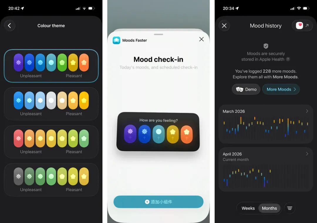 你可以在 App Store 免费下载 Moods Faster,付费可以解锁高级功能,包括扩展心情数量、解锁多主题与图标、主屏幕小组件等,费用为 1 元/月、11 元/年,28 元买断。