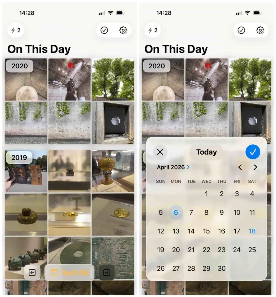 应用的首页简洁而「直白」,它没有像系统相册那样提供配乐滤镜完备的回忆混剪,只是用网格排列的照片、年份递减的瀑布流,来展现那年今日的记忆。不过,On This Day Rewind 也并没有局限于「今日」这个时间点,它在底部设置液态玻璃风格的日期调整按钮和日历,你可以自由地跳转到任意一天,回顾当天去了哪些地方,留下了哪些影像。
