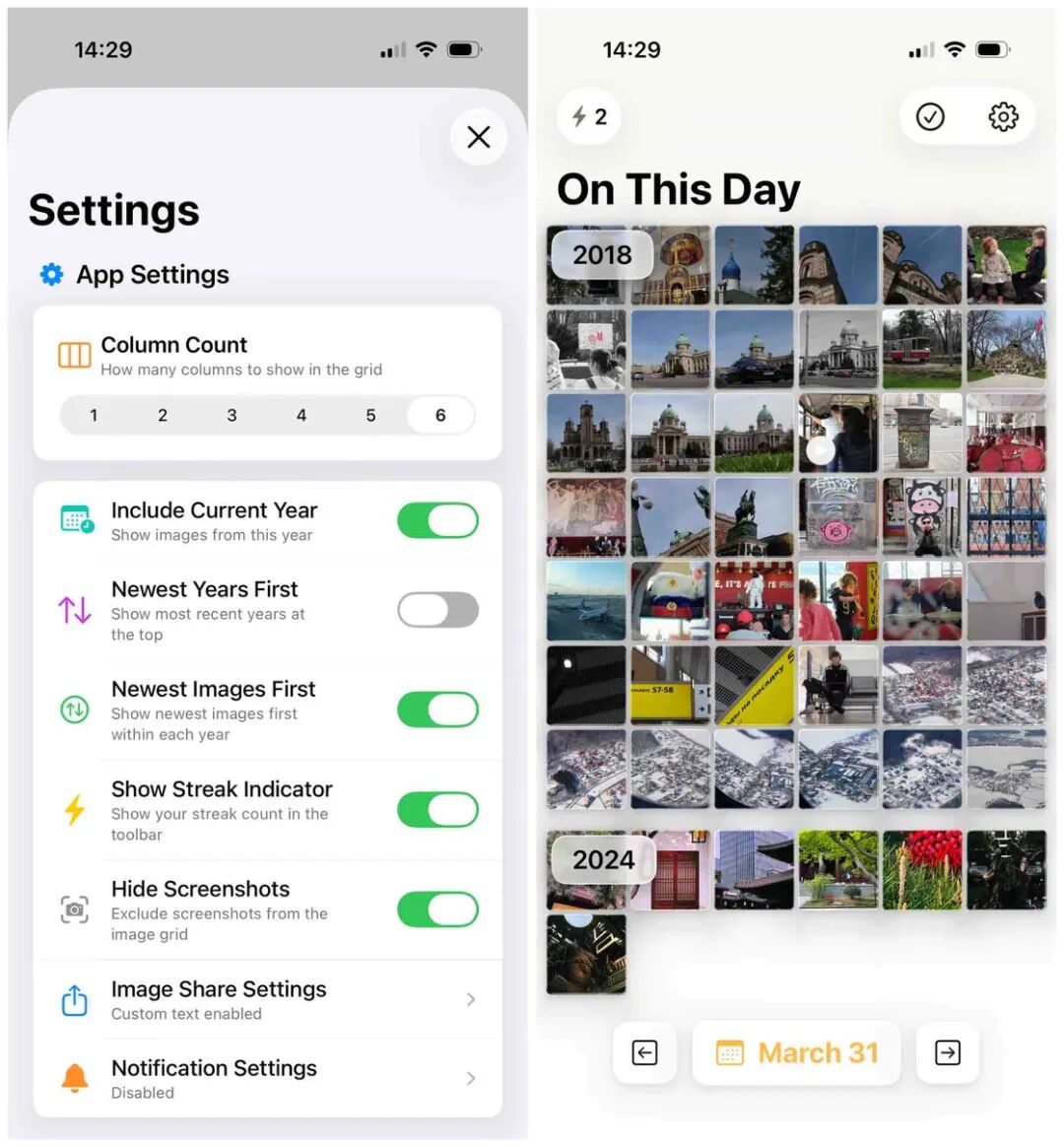 作为核心「卖点」,应用为首页布局提供了一些自定义项,你可以在单行显示 1-6 张照片缩略图的范围内调整布局,还可以调整年份由近到远或由远到近的显示次序。如果你只想回忆以前的美好,在设置中关闭 Include Current Year 选项,就可以隐藏当年拍摄的素材。
