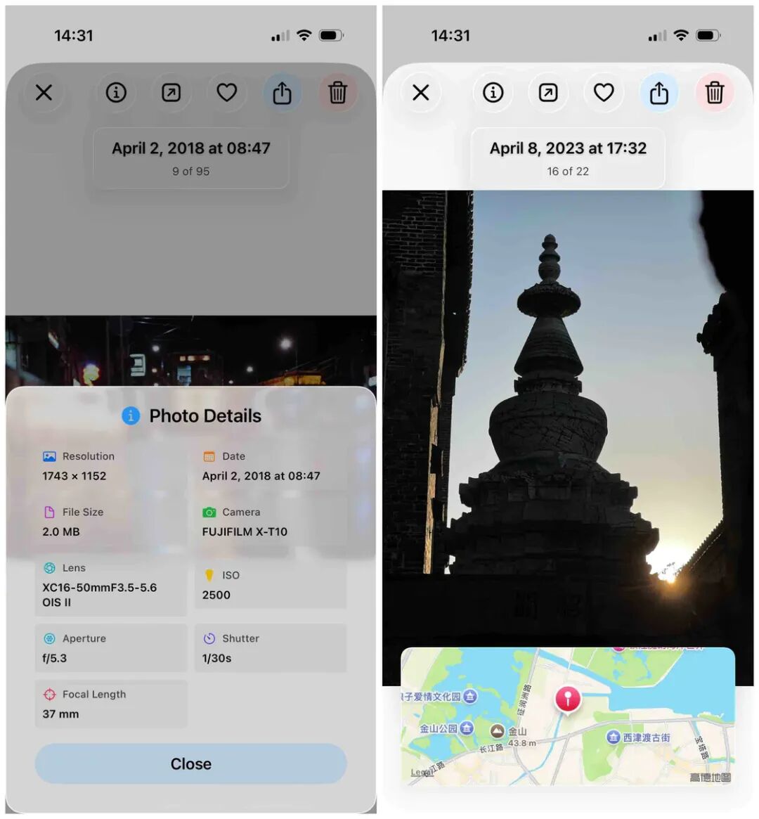 点击照片进入详情页,除了照片本身外,你还可以快速查看 EXIF 元数据和地图定位,帮自己回想起是用什么设备、什么参数以及在什么地点拍下的照片。在这里,你还可以同步系统相册对照片素材进行收藏和删除操作。
