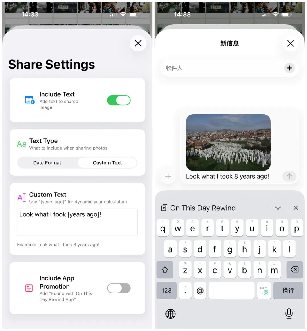 分享功能算是 On This Day Rewind 的一个小巧思,你可以在应用设置的 Image Share Settings 中预设分享的文案或日期格式,之后点击详情页中的分享按钮,就可以将文案及照片预览图一键分享给好友。不过,目前文案分享仅支持 iMessage、Mail 这类原生应用。