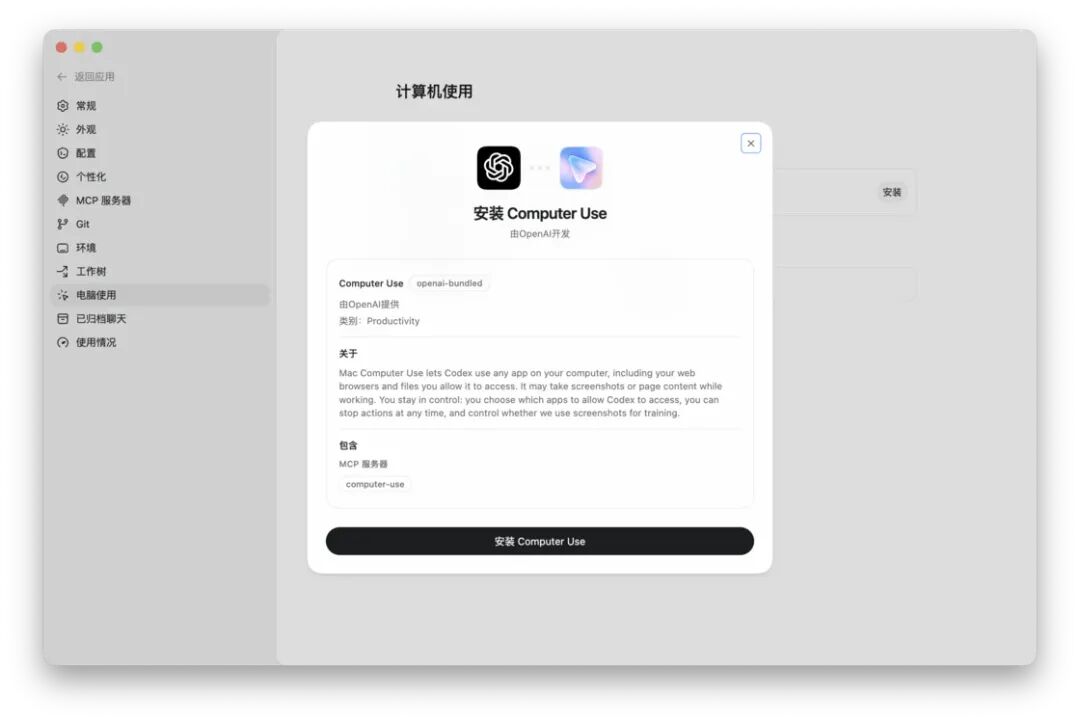 在使用 Computer Use 功能之前,确保自己将 MacOS 版的 Codex 更新到最新版本,然后在设置界面的「电脑使用」中启用相应的插件。