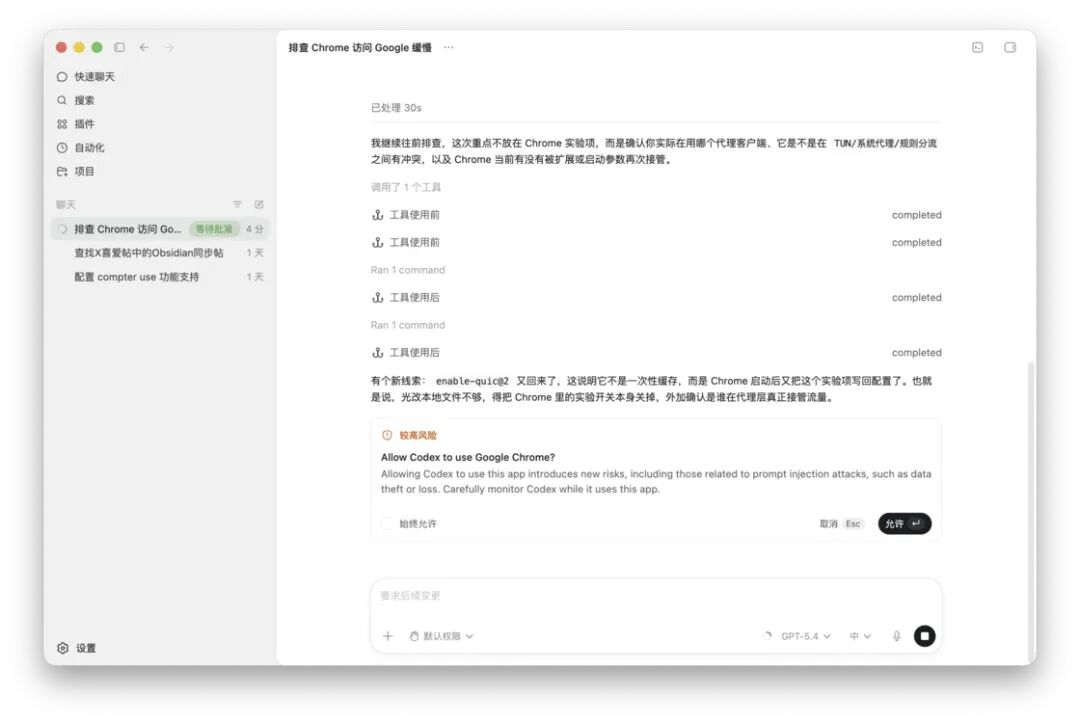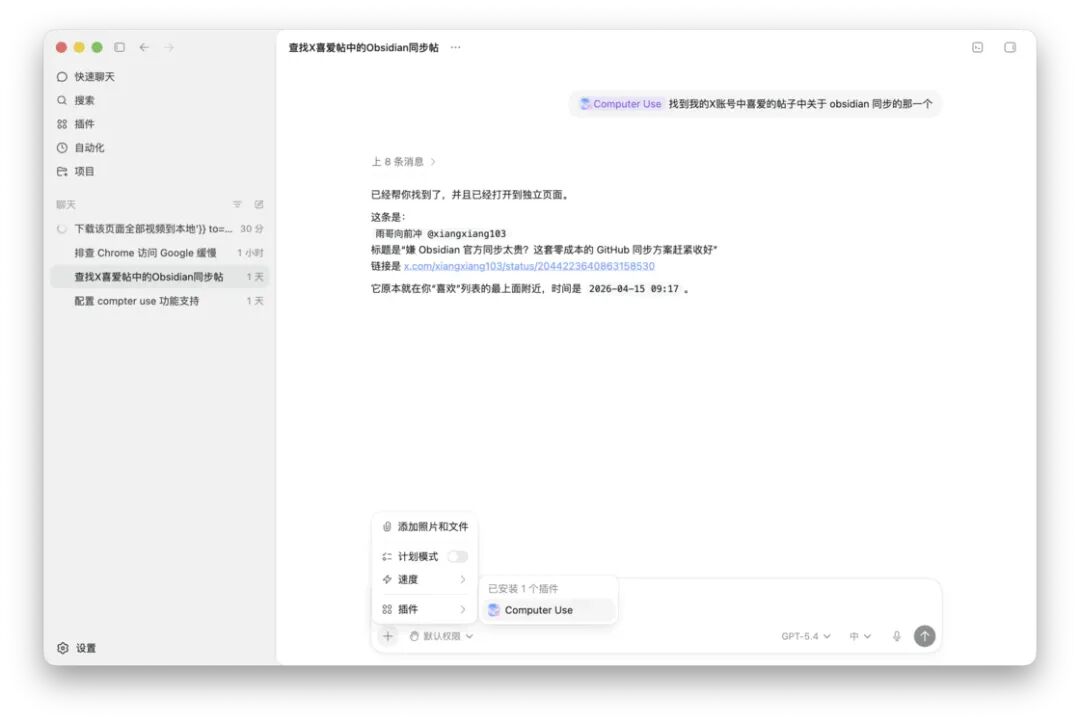 回到聊天窗口,如果我们想手动启用一个 Computer Use 的实例,只需点击加号按钮,然后选择插件中的「电脑使用」,就可以在聊天窗口中输入相应的指令,Codex 在获得你的授权后就可以对 macOS 系统中的任意应用进行接管并操作。如果在某一个任务中 Codex 自动提示你需要使用 Computer Use 功能,它会在聊天窗口中弹出提示信息,让你选择是否允许 Codex 使用某个应用。当 Codex 在操作应用程序时,菜单栏上还会显示有哪些应用程序正在被 Codex 接管,一目了然。