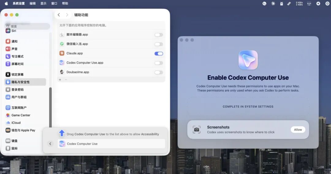 值得一提的是 Codex 的 macOS 版本在新版本中启用了一个非常方便且新颖的系统隐私与安全性权限的授权方式。以往我们需要在系统设置的「隐私与安全性」界面中通过加号按钮并选择应用来添加新的应用程序,而新版的 Codex 支持直接通过拖拽来将 Codex 添加到授权列表中。