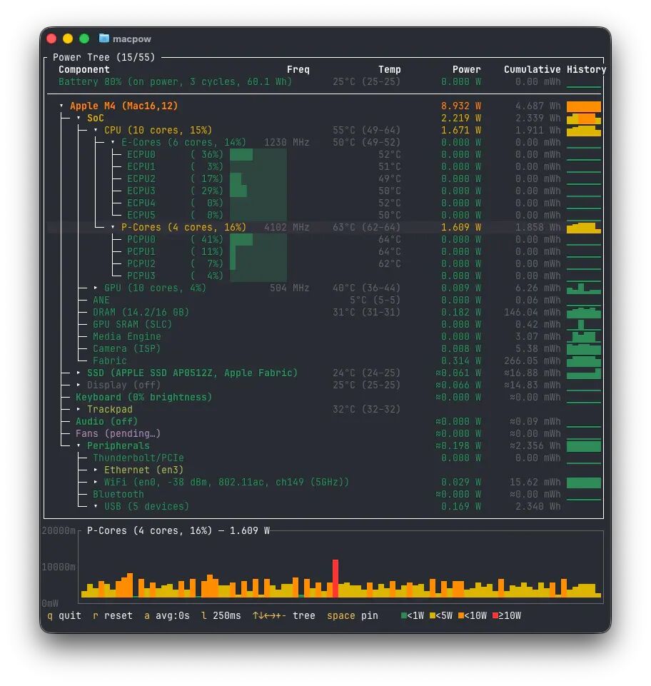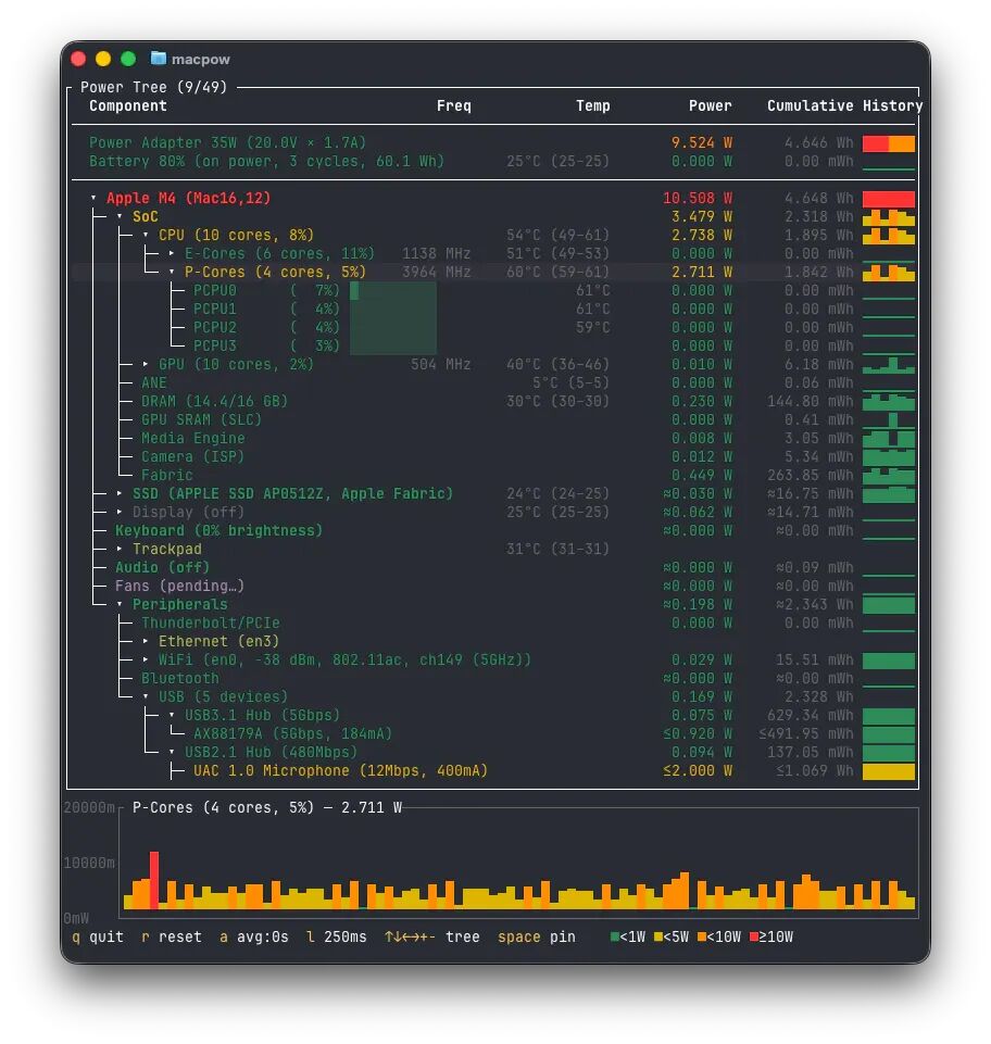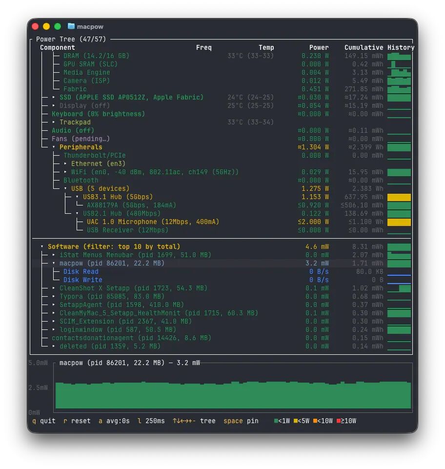 🖱️ macpow:通过 TUI 界面查看 Mac 实施功耗