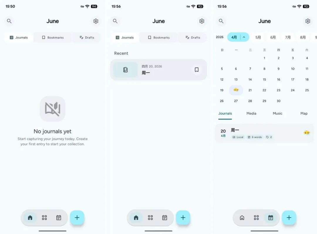 今天要介绍的 June 是一款开源的日记应用,从功能上来看,它做到了功能全面且有独特之处,我们不妨一起来探索一番。应用的主界面被分隔成了几个主要部分:主页、分类界面、统计界面。通过主页我们可以新建日记、查看近期的日记列表,快速查找过往的记录或是查看自己已经编辑但未保存的草稿。分类界面则将我们的日记通过空间、人员、标签分门别类进行展示,方便我们后续根据不同的维度查看自己的日记。日历统计界面则会直观展示我们当月记录日记的情况,在日历界面还能查看我们为日记添加的 emoji,从而对当日的心情做到一目了然。