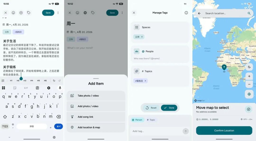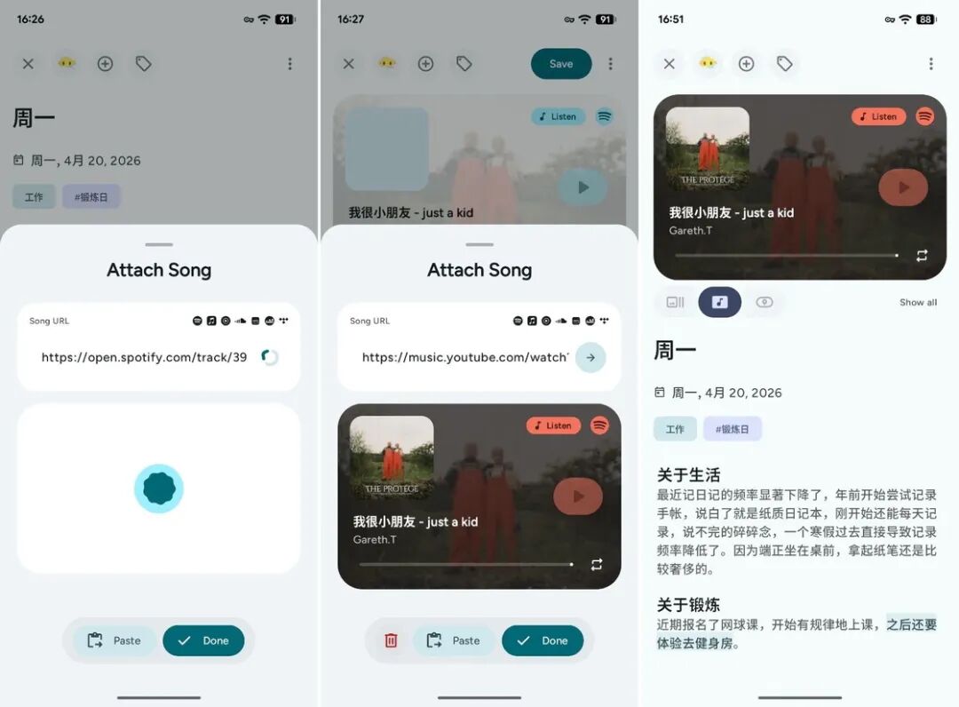 June 的添加附件功能则做出了差异化,除了一些常规功能如添加图片、视频、地点等,较为惊喜的是,June 还允许我们添加歌曲链接。June 可以解析来自 Spotify、Apple Music、YouTube Music 等常见流媒体平台的歌曲链接,并生成歌曲卡片置于日记内容的顶部,如此一来,我们不但能完成当天的文字记录,还能在后期查看日记时,伴随着音乐声回顾当天的心境。