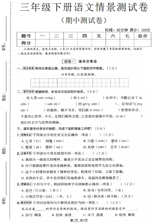 三年级下册语文《期中检测卷》多套,电子版可打印