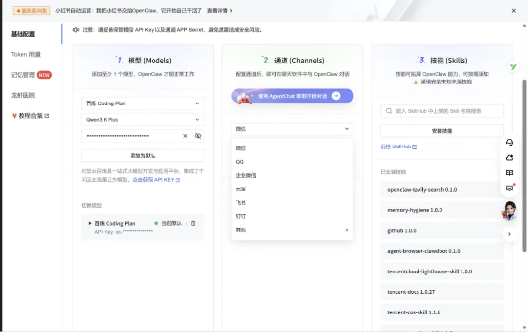 2.通道:下拉菜单里选择就可以了,个人使用推荐微信,系统会生成二维码给你扫的,你打开微信扫一下,然后系统会自动开始配置。1.2.这两项配置完成后,龙虾就可以使用了!你微信上出现一个好友叫微信ClawBot,这就是你和龙虾通信的渠道。