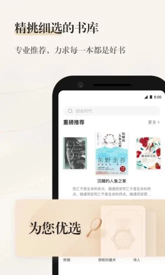 顶部搜索框:精准搜索书名 / 作者 / ISBN分类导航:小说、文学、经管、科技等20+分类排行榜:出版高分榜、畅销榜、新品榜实时更新 - 🎧 有声书听读模式
