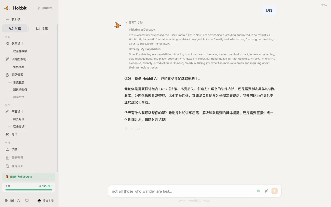 这是 Hobbit 最基础的入口,一个针对青训教练场景深度定制的对话界面。